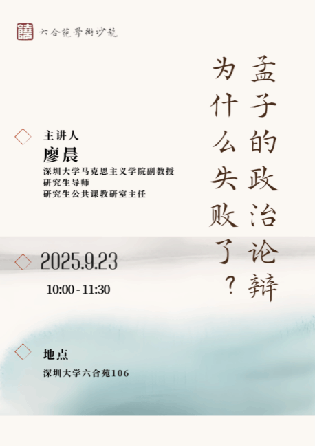 讲者介绍:廖晨,深圳大学马克思主义学院副教授、研究生导师、研究生公共课教研室主任,主要研究方向为中国逻辑史,近年来致力于先秦逻辑,尤其是孟子政治论证理论的研究。主持国家社科基金项目一项,省级等各类项目多项,获省级教学奖多项。于新华出版社出版专著一部,在《逻辑学研究》等期刊发表论文多篇。